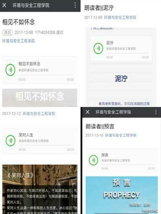 文化就隐藏在这一篇篇经典、一个个文字中,“朗读者”这个舞台,就是要化无声为有声,让每个人成为独一无二的朗读者。“朗读者”活动充分借鉴中央电视台文化情感类节目,每期由主持人引出本期的朗读主题后,几位朗读者各自利用十分钟左右时间,朗读自己准备的读本。这些读本,有些是同学们在图书馆内翻阅并挑选出来的现代散文、短篇小说,有些则是来自网络上的心仪文章。主持人会对本期主题、朗读者的读本内容、朗读者现场表现进行总结和集中点评,在场的老师们也会登台与同学们分享自己相关主题的经历。每期朗读活动完成后,我院新媒体成员负责录制成微信音频推送,方便所有爱好朗读的师生能随时聆听。