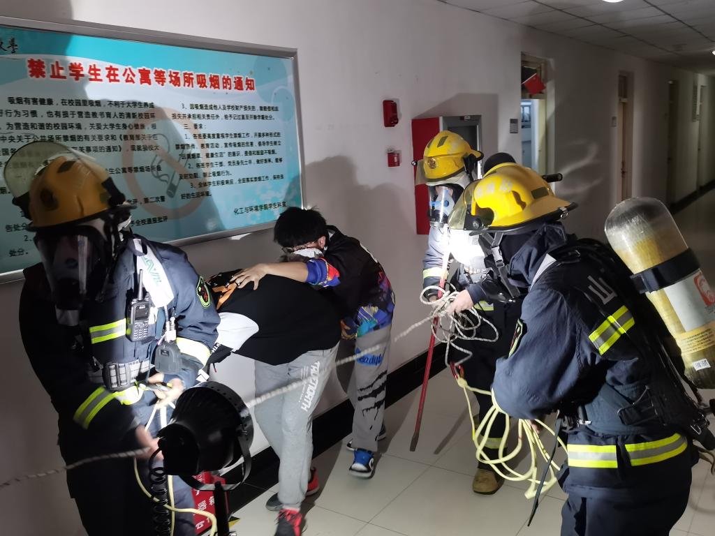 下午16:00点随着警报声的响起,在消防员战士的指导下,同学们井然有序地撤出宿舍楼,并从学生心态、学生思想、逃生方式等方面对本次演习中出现的问题进行点评与指正。