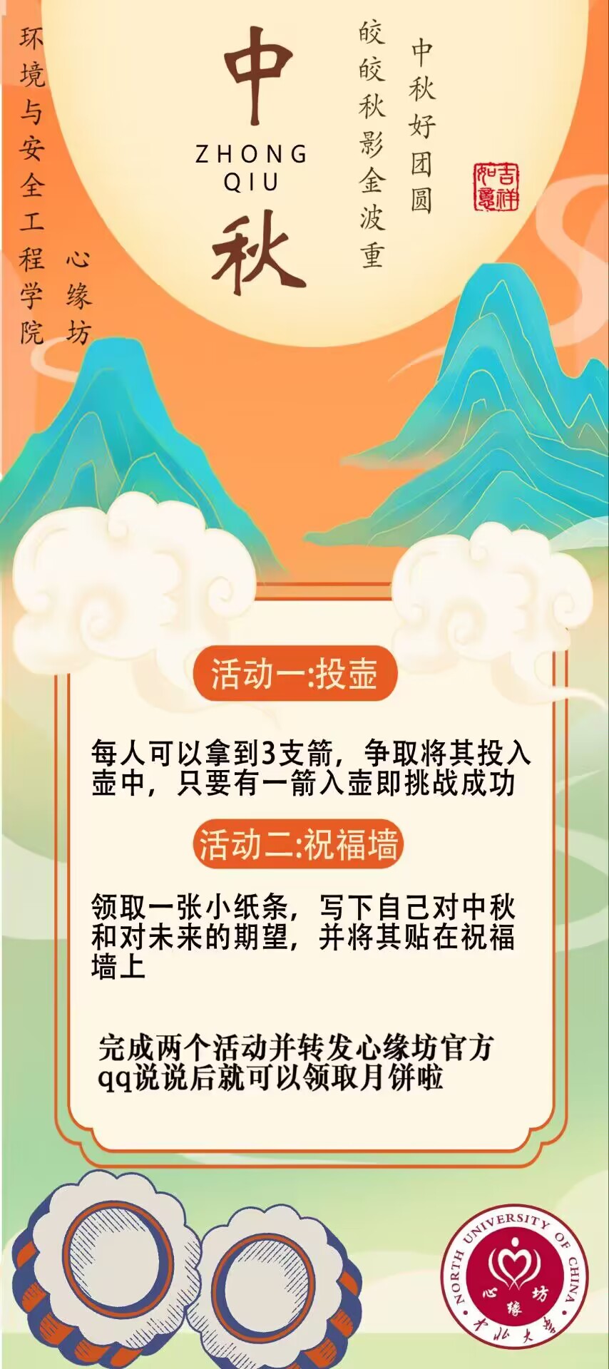 本次中秋活动采用小游戏的形式,在完成投壶游戏并写下自己对中秋的祝福或对未来的愿景后就可以领取到小礼品,此次活动吸引了大量学生前来参与,学生们在工作人员的指引下,积极参加小游戏,并有序排队领取奖品。