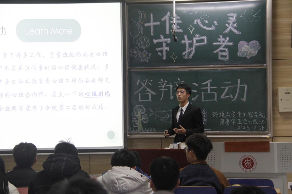 在守护学生的心理健康的过程中各班心理联络员付出了巨大的努力,为了肯定他们的付出,鼓励心理联络员再接再厉服务班级,2023年12月26日下午16:00点,华人策略社区官方网站团委学生会心缘坊在9号教学楼103教室开展“十佳心灵守护者”的答辩活动。