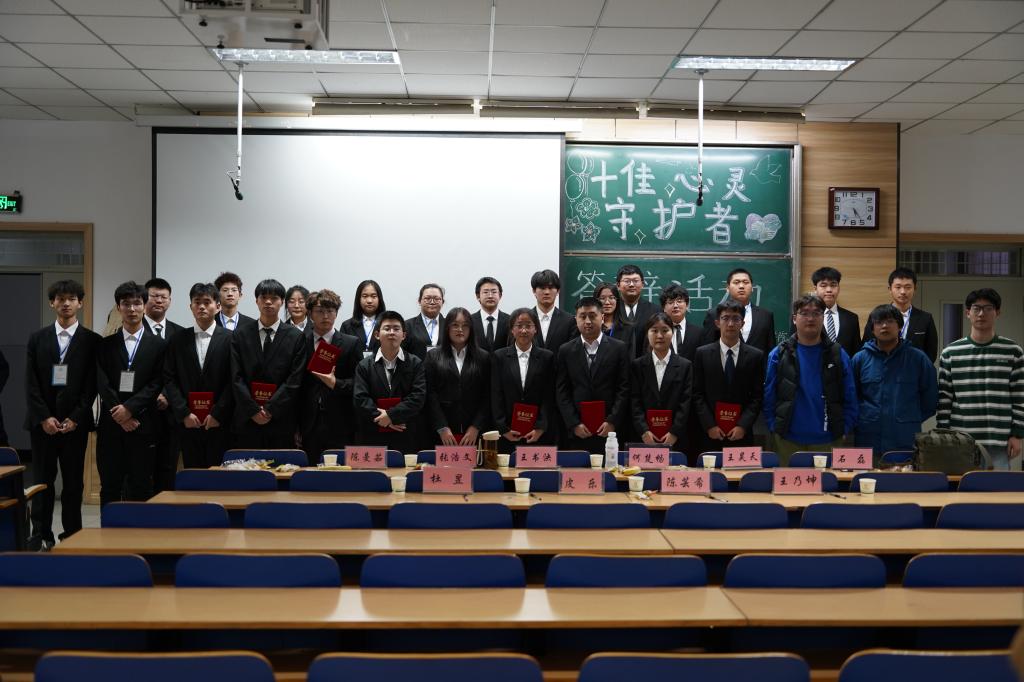 按照顺序,参加答辩的选手依次上台,他们从个人简介、工作总结、个人感悟、未来展望四个方面进行答辩,他们或轻松欢快,或娓娓道来,博得了阵阵掌声。活动中,主持人带领学生玩了几个放松的小游戏,并为同学送上精美小礼品,极大的调动了学生的参与度和情绪。经过演讲,最终有十位同学都被授予了“十佳心灵守护者”称号。颁奖结束后,各位答辩选手、评委以及工作人员合影留念。