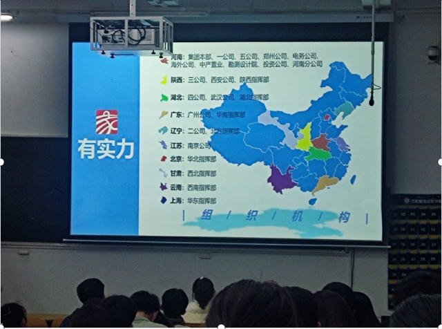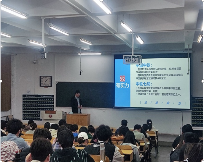 紧接着中铁七局宣讲人通过地图向我们展示了中铁七局的各公司所在地及主要工作点,又以各类数据图和排名向我们证明了中铁七局是一所极其优秀的国有企业。而后中铁七局宣讲人引用专业知识,以极其巧妙的语言艺术,专业且诙谐地回答了同学们所在意的诸多问题,让大三大四的同学们对于进入企业后的工作内容、工作环境与工作收入有了初步的了解。